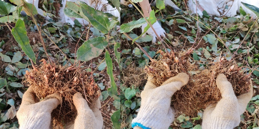 通過對采挖的淫羊藿種苗進(jìn)行觀察,分蘗芽多且飽滿,證實(shí)此地適宜淫羊藿的種植。在項(xiàng)目組成員和當(dāng)?shù)厮庌r(nóng)的共同努力下,兩天完成了約三畝淫羊藿種苗的采挖工作。